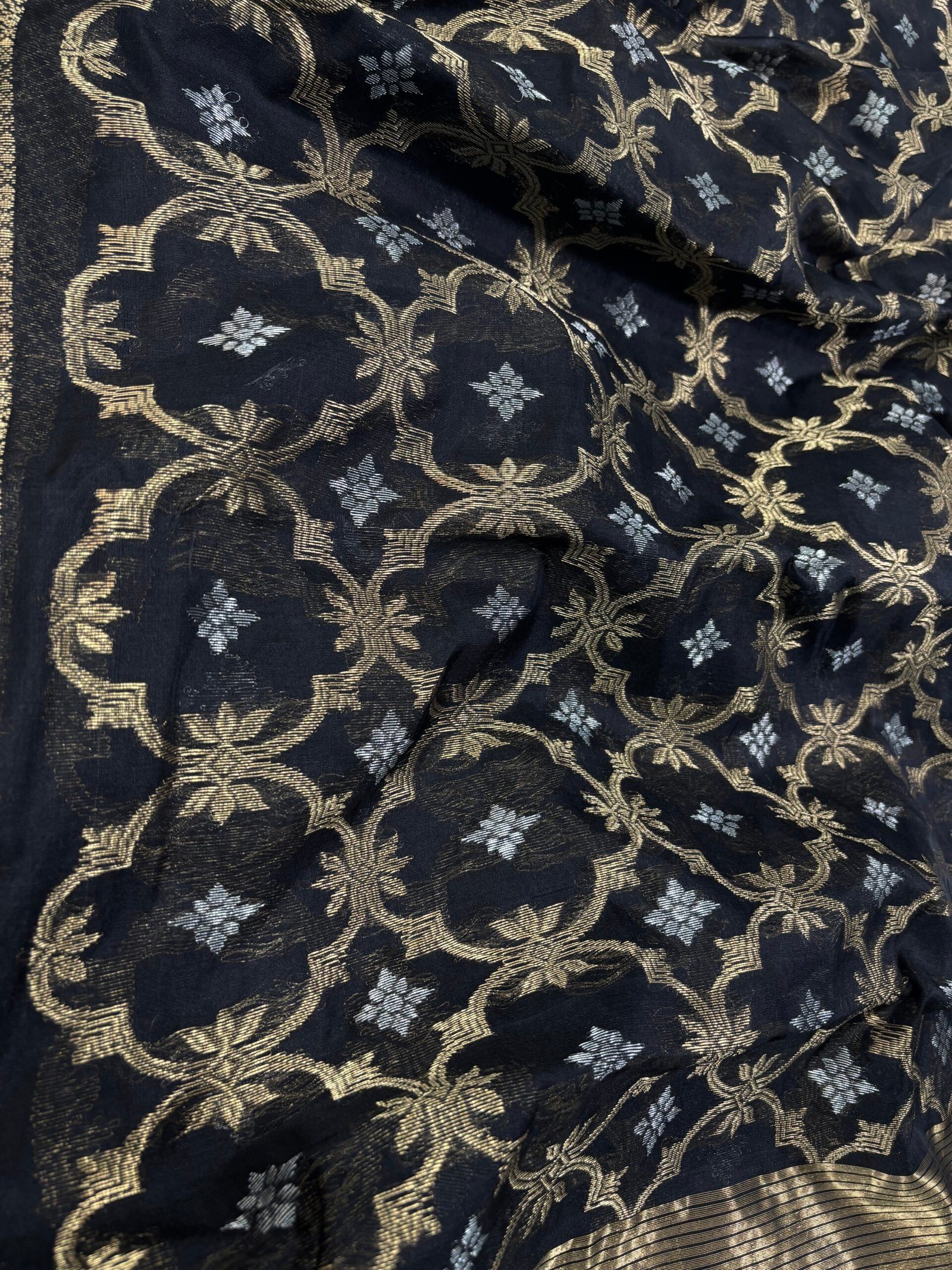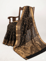 The deep black base enhances the beauty of the delicate golden zari floral patterns woven throughout the saree, giving it a graceful and luxurious appeal. The broad golden zari border and richly designed pallu add a royal touch, making it an excellent choice for festive occasions, weddings, cultural events, and traditional celebrations.
