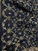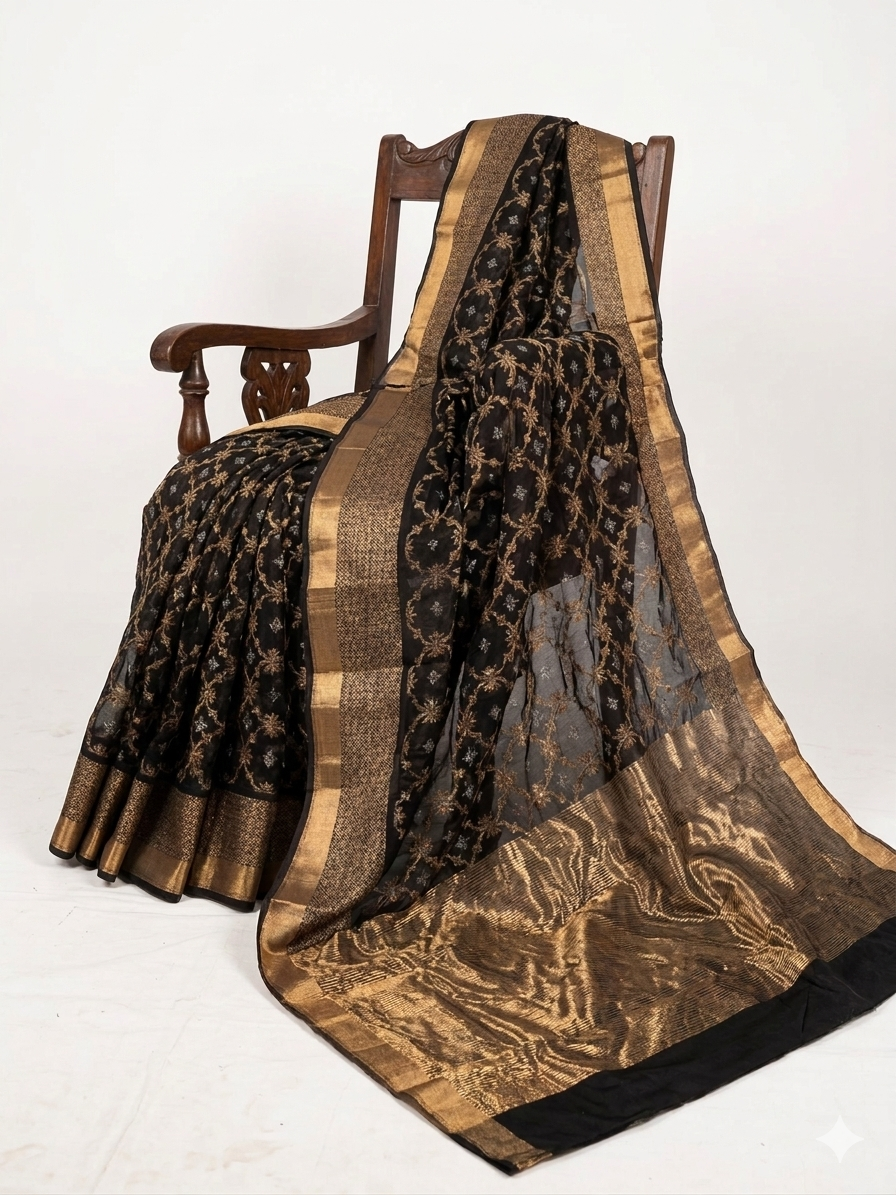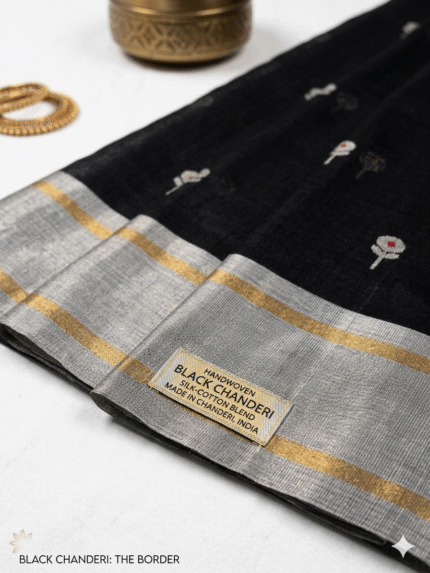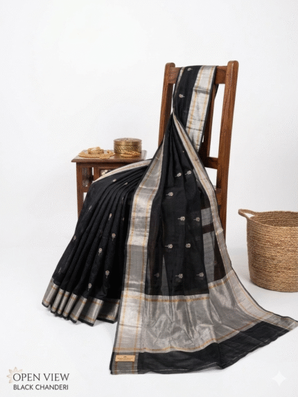 Add timeless elegance to your ethnic wardrobe with this stunning Black Chanderi Silk Saree, beautifully designed with intricate golden zari floral motifs and a rich traditional border. Crafted from premium Chanderi silk, this saree reflects the heritage and craftsmanship of authentic Indian handloom weaving.