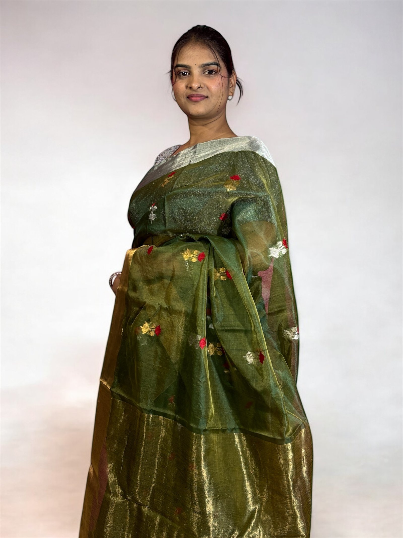 Perfect for festivals, weddings, and special occasions, this saree drapes beautifully and offers unmatched comfort throughout the day. Its soft texture and subtle shimmer make it an ideal choice for women who love combining heritage with modern elegance.