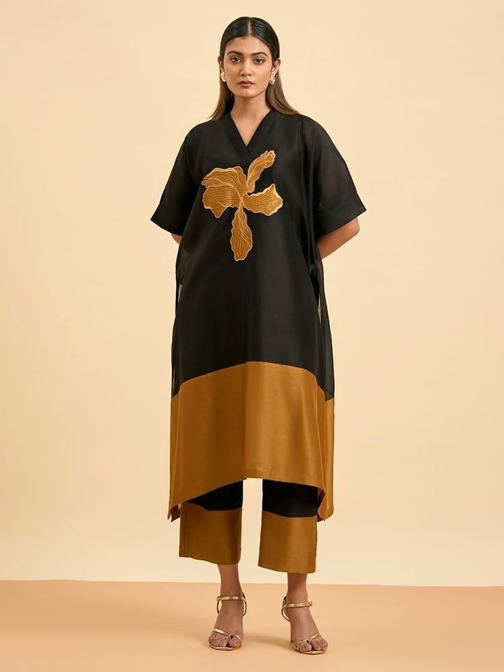 This striking Black & Mustard Silk-by-Silk Kurta Set blends sculptural artistry with effortless luxury. The kurta features a bold handcrafted floral appliqué in deep mustard, blooming beautifully across the chest like a golden brushstroke. Its asymmetrical hemline, relaxed sleeves, and premium silk-by-silk fabric bring movement, comfort, and sophistication to your everyday dressing.