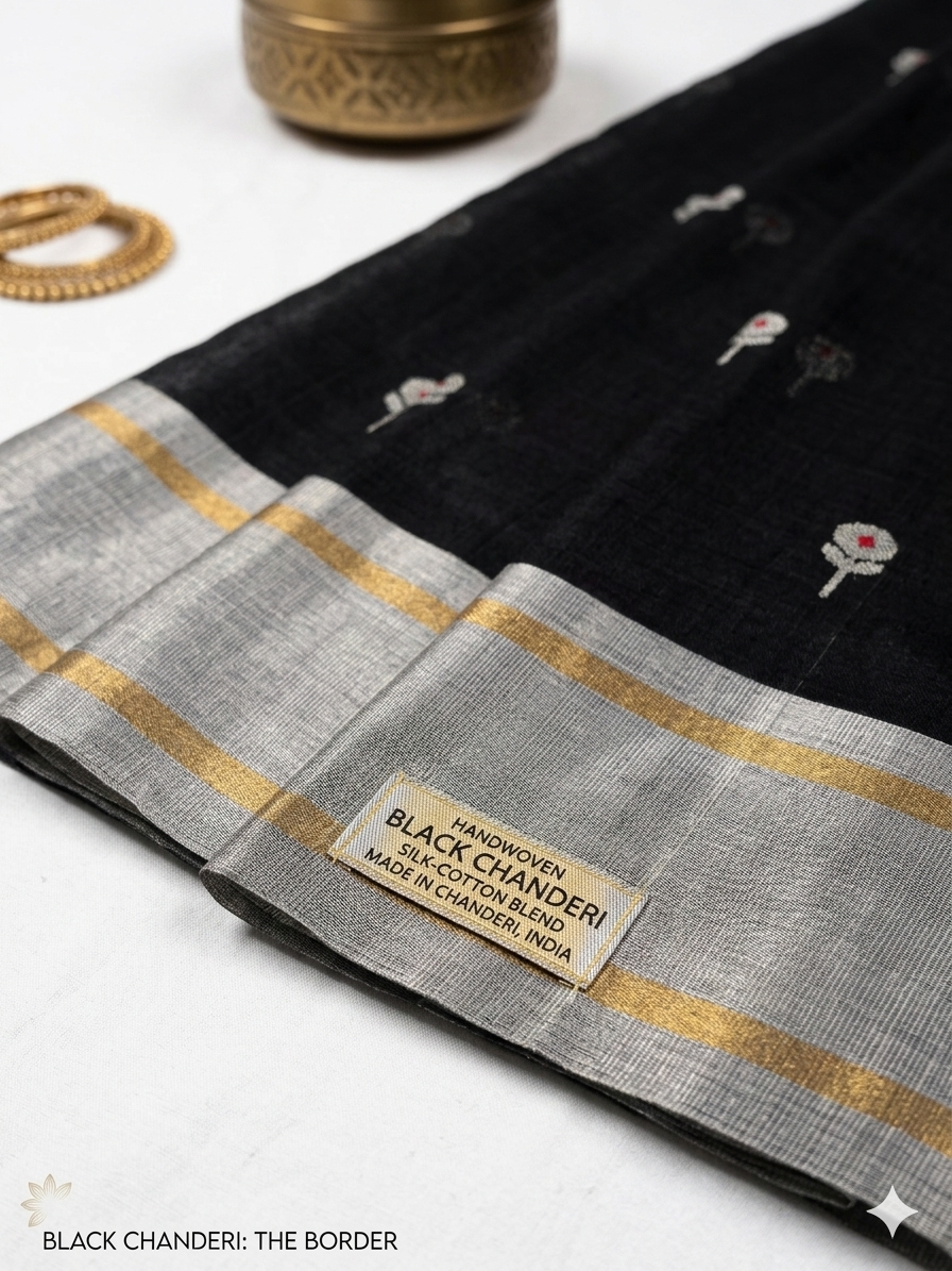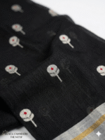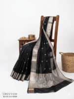 The saree features delicate zari woven motifs across the body, giving it a subtle yet luxurious look. The highlight of this piece is its rich silver zari border with fine golden detailing, creating a stunning contrast against the deep black base. This combination makes it perfect for festive occasions, evening gatherings, cultural celebrations, and wedding functions.