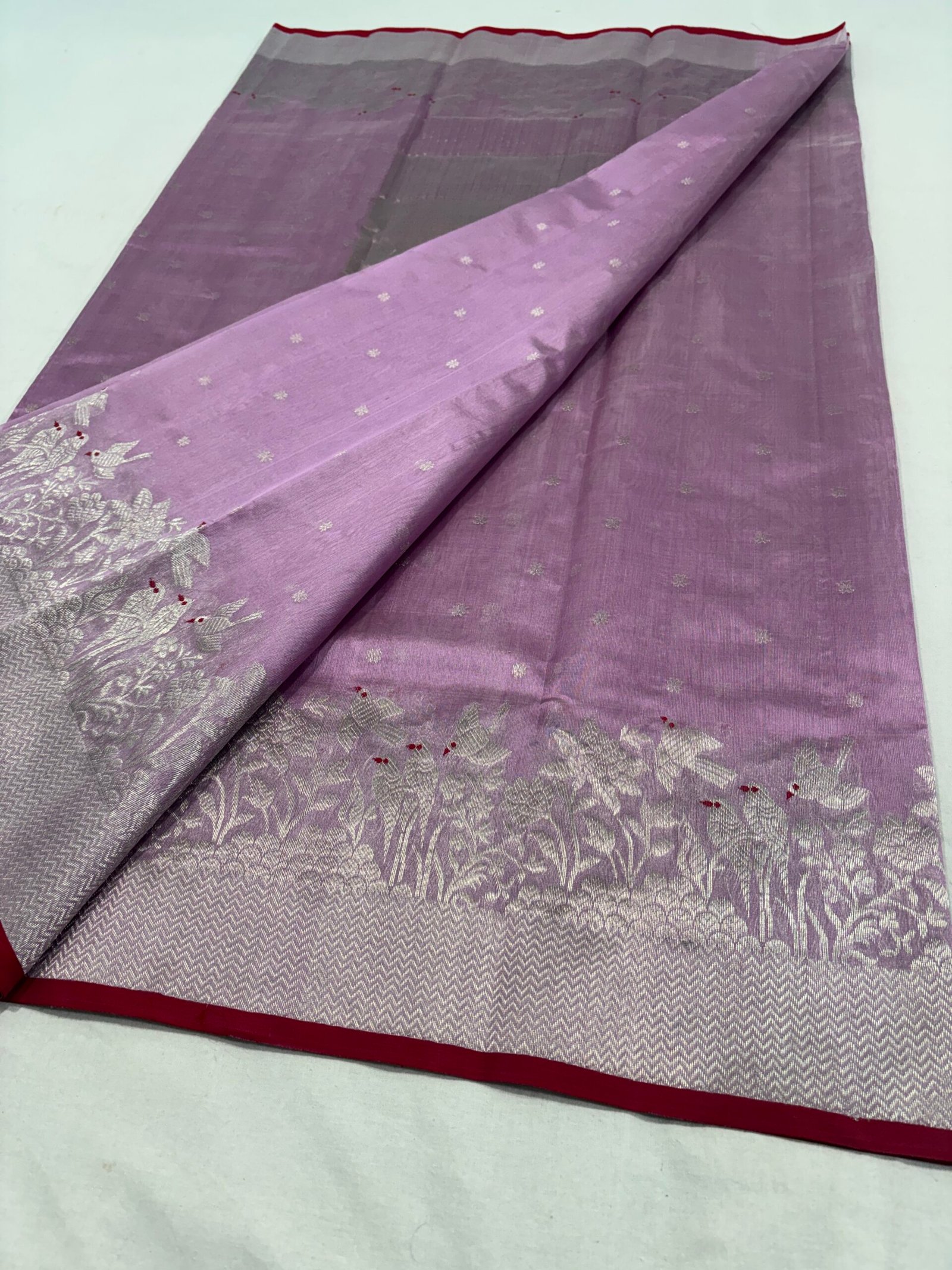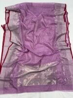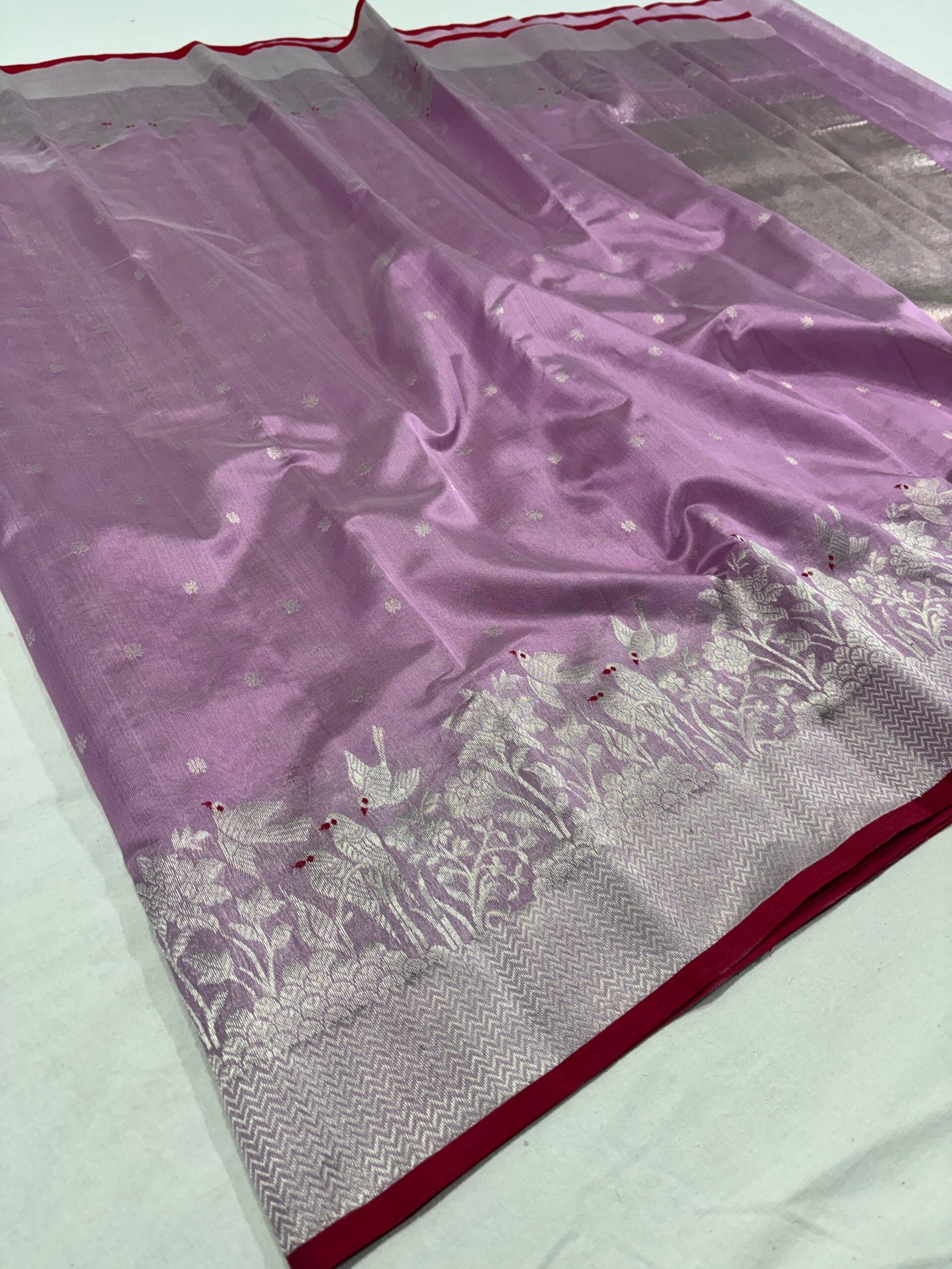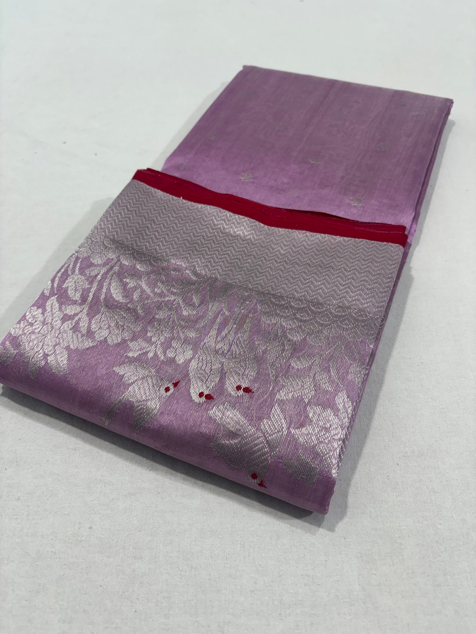 Elevate your ethnic style with this stunning piece from our original Chanderi silk sarees collection. This lavender Chanderi silk saree is beautifully crafted with fine silver zari buti motifs scattered gracefully across the body.