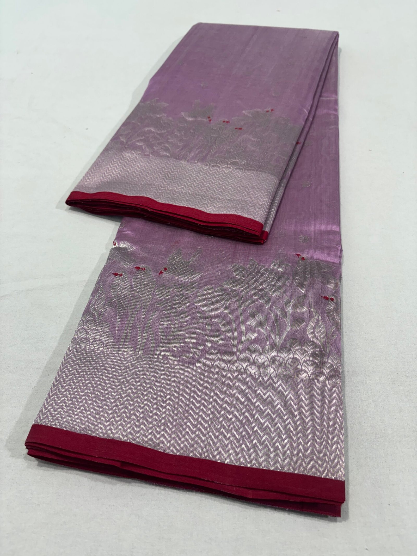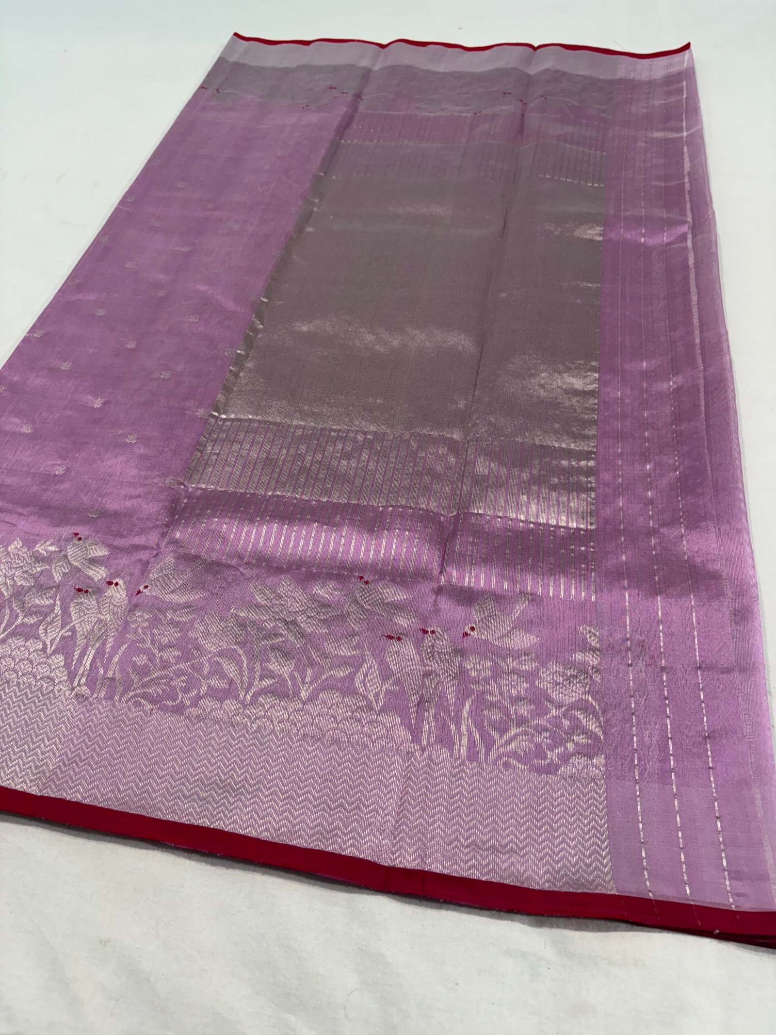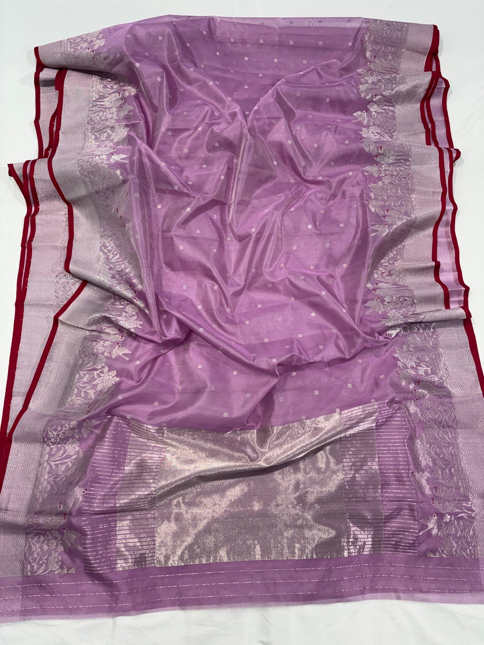 Elevate your ethnic style with this stunning piece from our original Chanderi silk sarees collection. This lavender Chanderi silk saree is beautifully crafted with fine silver zari buti motifs scattered gracefully across the body.