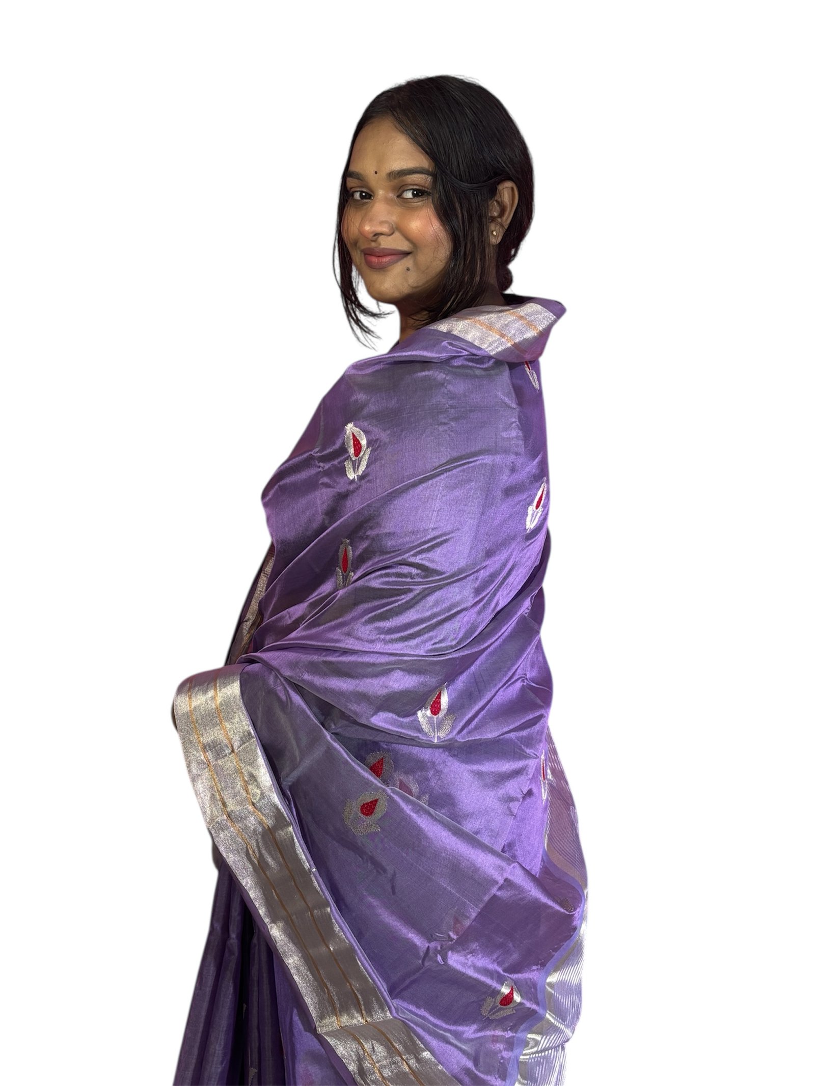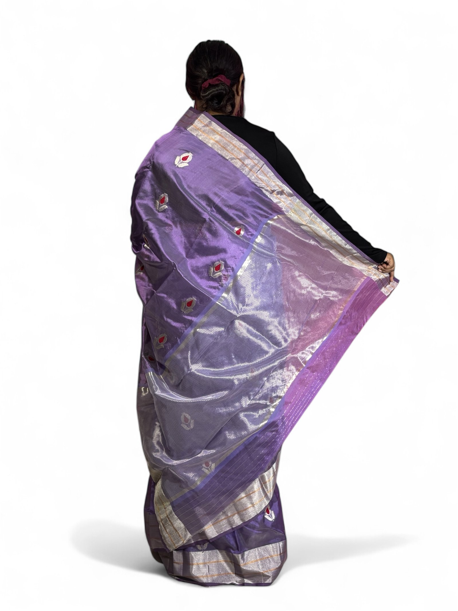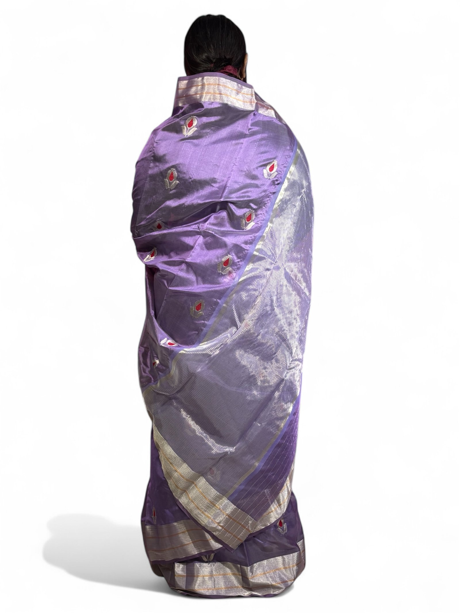 Each saree is crafted using the finest blend of silk and zari threads, reflecting India’s rich textile heritage. The delicate motifs—peacocks, lotuses, and geometric patterns—are intricately woven using traditional looms, giving every piece a story of craftsmanship and culture.