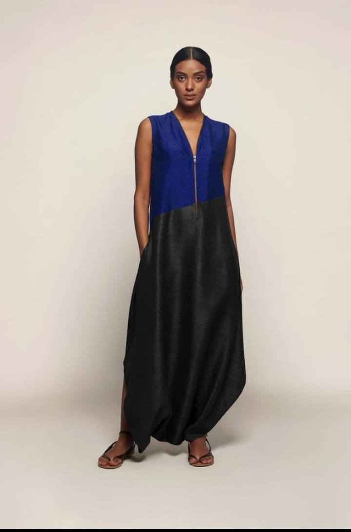 This elegant Royal Blue & Black Silk-by-Silk Maxi Dress is crafted for women who love effortless luxury. The sleeveless silhouette, soft sheen fabric, and contemporary color-block design create a bold yet graceful statement. Featuring a sleek front zipper and fluid drape, the dress blends modern minimalism with rich Indian textile charm. Perfect for evening outings, festive gatherings, holiday wear, or sophisticated casual styling.